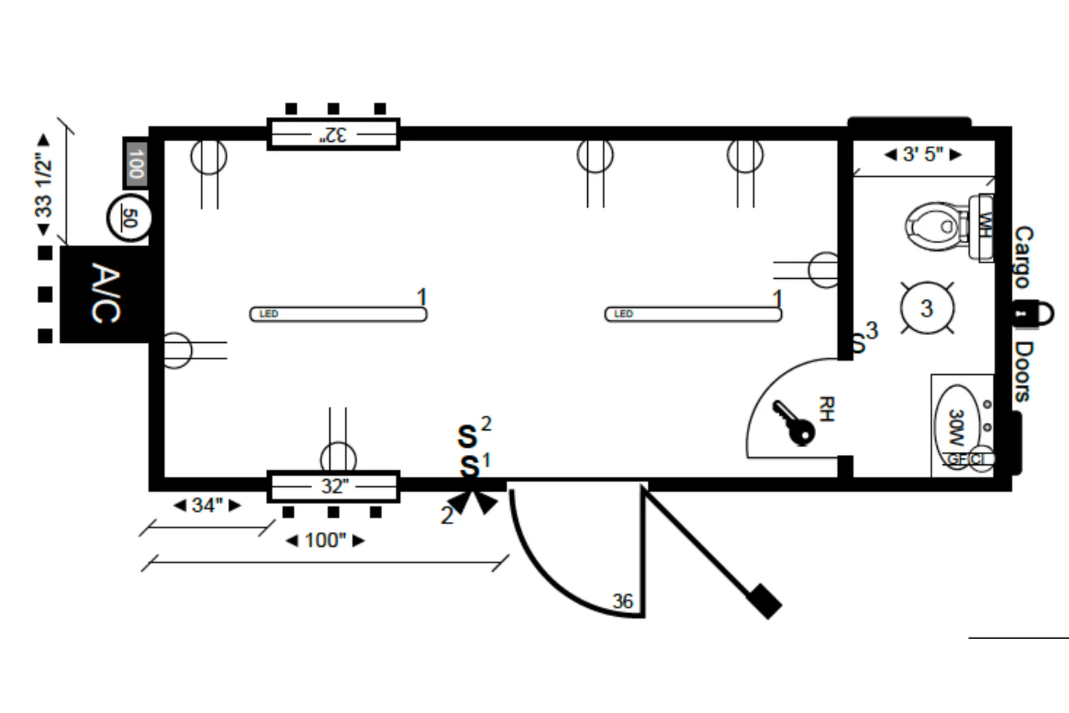 Comprehensive Electric Package: Includes a 100 Amp service panel, (2) 4’ interior LED lights, (1) interior can light, (6) interior outlets, and an exterior LED floodlight for comprehensive coverage. A 50 Amp generator inlet ensures uninterrupted power.